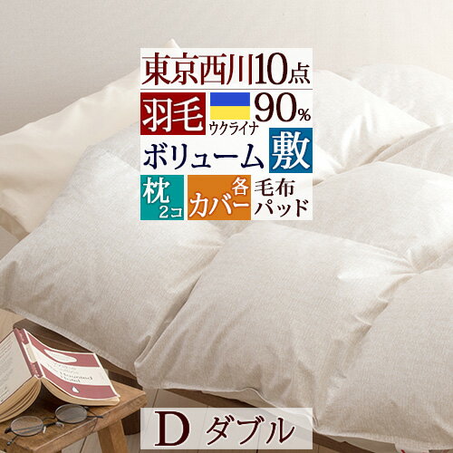 西川 布団セット ダブル 東京西川 羽毛布団 送料無料 10点セット 羽毛掛け布団 敷き布団 枕 日本製カバー 綿毛布 パイル敷きパッド お布団セット 組布団 セット ダブルサイズ 西川産業などその他国内メーカー ●羽毛布団/47259 ■サイズ:ダブル 190×210cm ■詰め物:ウクライナ産ホワイトダックダウン90% フェザー10% ■詰め物量:1.7kg ■フレッシュアップ加工/サニタイズ加工 ■ダウンパワー380 ■側生地:綿100% 抗菌防臭加工 ■キルト:立体キルト5×5マス ■製品重量:約3.0kg ■日本製 ■西川株式会社/西川産業[東京西川] ●敷き布団/4353 ■サイズ:ダブル140×210cm ■表層[巻き綿]:ウール50% ポリエステル50% 2.8kg ■中層[中芯]: ポリエステル固綿100% 4.2kg (プロファイル加工シート1.4kg+ウェーブ加工シート2.8kg) ■詰め物量:約7.0kg ■生地:綿100% 抗菌防臭加工 防ダニ加工 ■日本製 ■西川株式会社/西川産業[東京西川] ●枕/7614 ■サイズ:37×57cm ■生地:ポリエステル100% ■詰め物:ポリエステル100% ■中国製 ■西川株式会社 ●掛けカバー/48640 ■サイズ:ダブル 190×210cm ■8ヶ所ホック付テープ ■全開ファスナー ※生地に継ぎ目があります。
