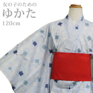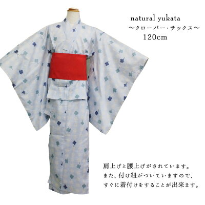 ナチュラル系 女児浴衣セット クローバー・サックス 120cm 作り帯付き 肩上げ済み・腰上げ済み・付け紐付き 綿100% naturalカラーでちょっとお洒落に素敵に浴衣を楽しもう