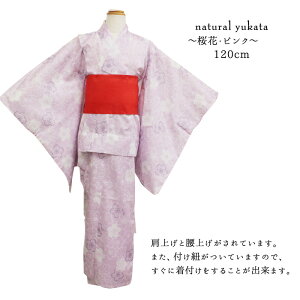 ナチュラル系 女児浴衣セット 桜花・ピンク 120cm 作り帯付き 肩上げ済み・腰上げ済み・付け紐付き 綿100% naturalカラーでちょっとお洒落に素敵に浴衣を楽しもう
